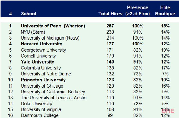 此外,哈佛商学院也非常不错,但由于班级规模较小,导致这些顶级投行的校友较少,加上哈佛的许多学生甚至选择不从事投资银行业务,所以数字没那么高。