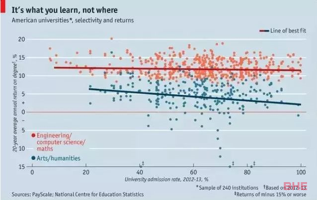 《The Economist》曾做过一个关于大学选择与回报的调查研究。大数据表明:从未来的收入水平来看,“学什么专业”,比“在哪里学”更重要。