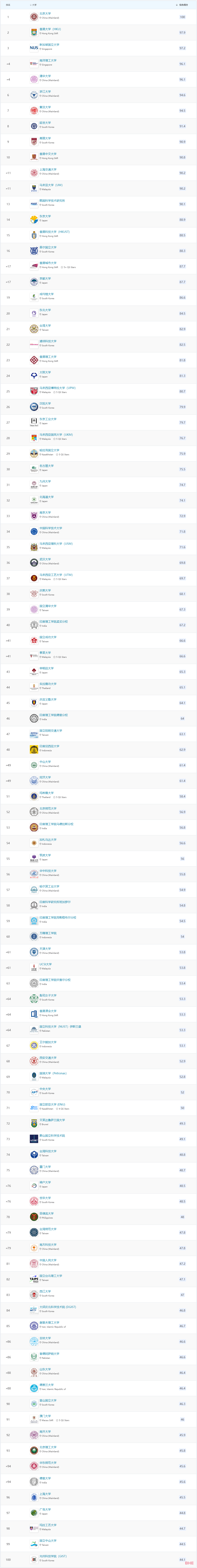 台湾大学下降2名,今年位列第21,排名中国台湾地区名。东京大学、延世大学则分别代表了日本和韩国的最高水平,分别位列第14、第八名。