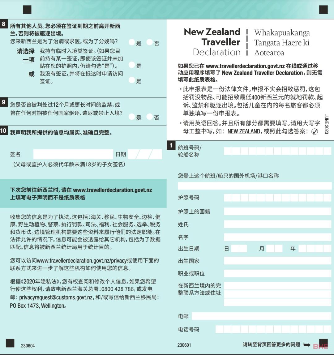 所有前往新西兰的旅客必须在到达新西兰之前填写新西兰旅客声明。您可以在NZTD网站 (TravellerDeclaration.govt.nz)上填写数字声明。