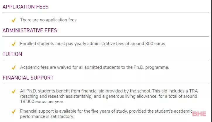 不收申请费,需要交300欧注册费、免收学费、助教费+生活津贴大约每年19000欧、附加学术津贴