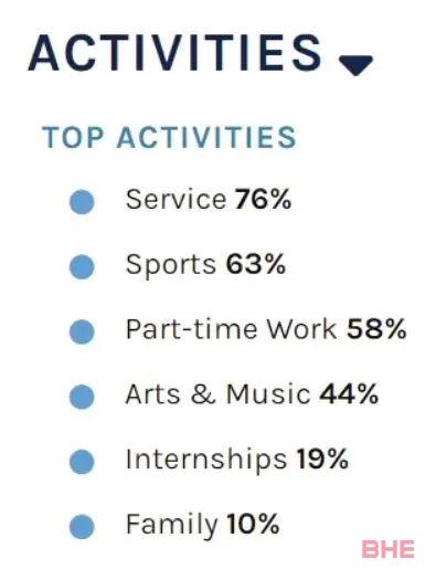 在新生活动及经历,服务和体育占比最高,分别为76%和63%。北卡一直都是体育强校,该校的篮球队非常出名,除了篮球巨星乔丹以外,还有非常多的篮球明星都毕业于北卡教堂山,其篮球校队也多次获得NCAA全美篮球的冠军。