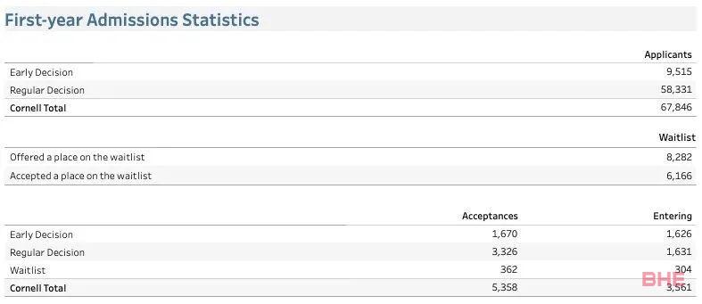 四年制大学的5455名申请人中,有739人被录取,最终582人选择转入康奈尔大学就读;两年制社区学院的1126名申请人中,有95人被录取,最终77人选择转入康奈尔大学就读。