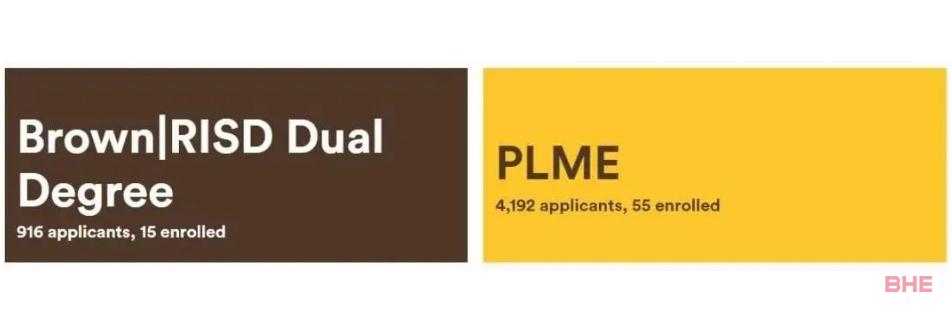 布朗大学和罗德岛设计学院的双学位项目共有916名申请者,最终有15人确认入读。PLME自由医学教育项目共有4192名申请者,最终有55人确认入读。