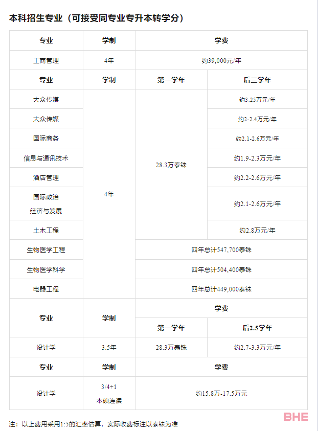 三年费用约18万元(注:申请时需缴纳7.98万元);录取后每学期缴纳100,000泰铢)共六学期,(实际学费收费标准以泰铢为准,按照缴费时的汇率实时换算)。