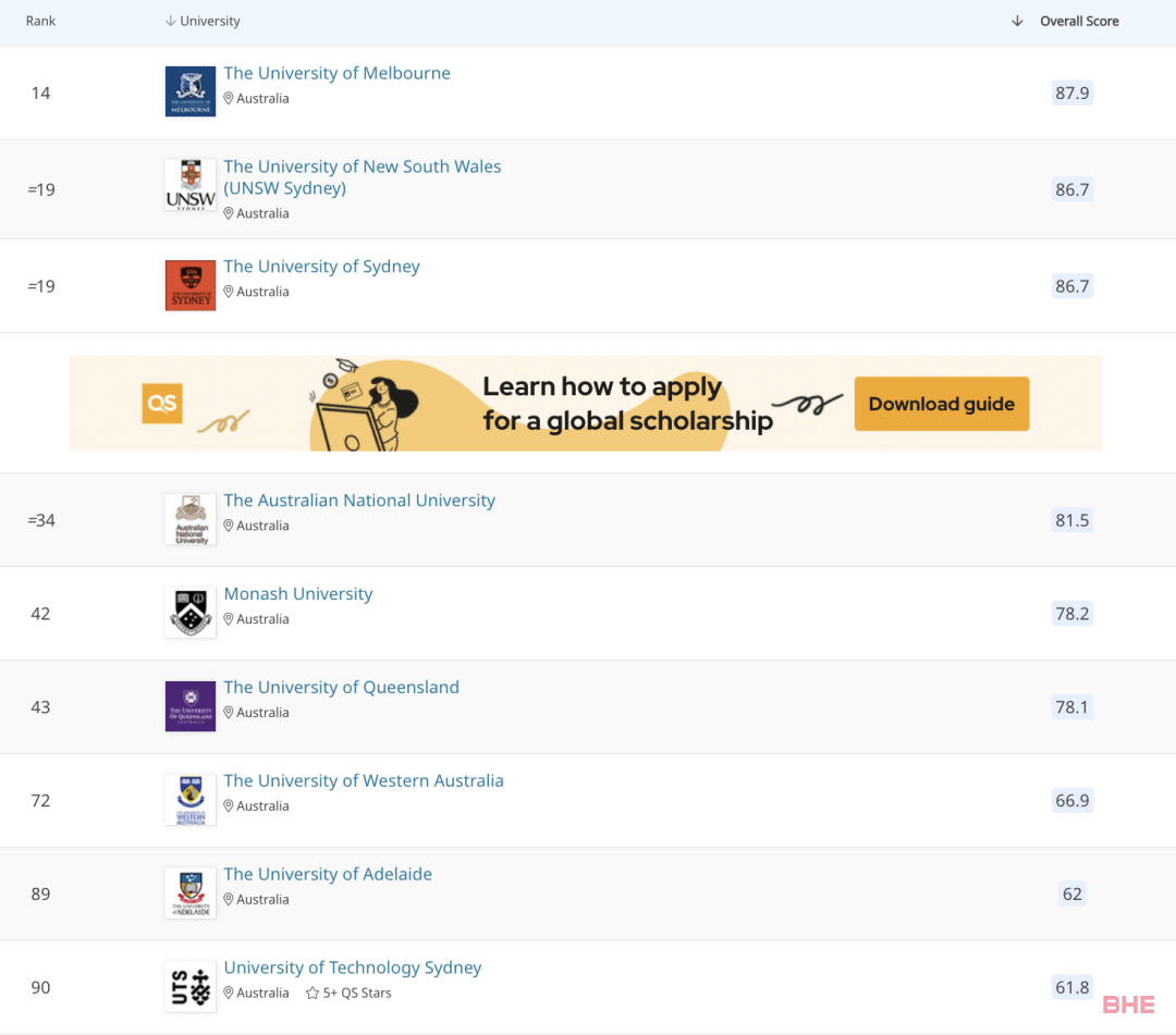 3所大学进入TOP20(墨尔本、新南威尔士、悉尼),6所进入了TOP50(澳国立、莫纳什、昆士兰)。