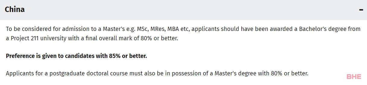对于中国大陆地区的申请者,官网也是给出了基本申请要求,申请人需211学士学位,总分达到80分或以上(85分以上者优先考虑),才能被考虑申请硕士学位,如理学硕士、教育硕士、工商管理硕士等。这对于双非背景的小伙伴来说很不友好。