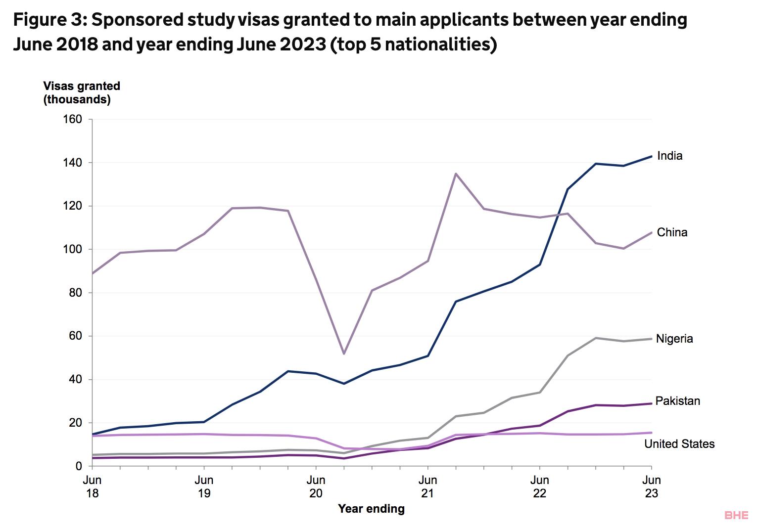 其他发放英国学生签证量最多的国家还有尼日利亚、巴基斯坦和美国。过去一年内,尼日利亚的签证数量增长了73%,达到了58,680个。