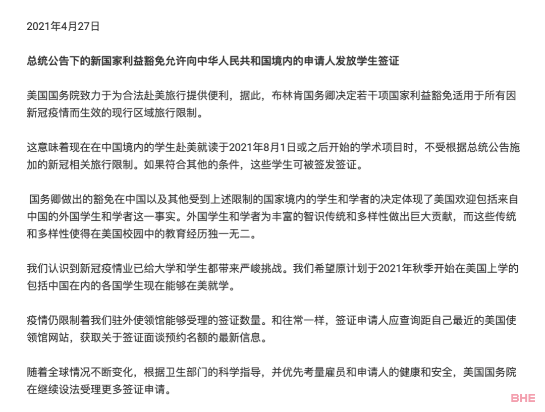 美国驻华大使馆发布题为“新国家利益豁免允许向中华人民共和国境内的申请人发放学生签证”的公告。