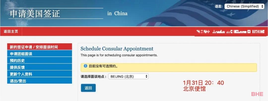 ▲1月31日北京使馆F1签证预约界面截图