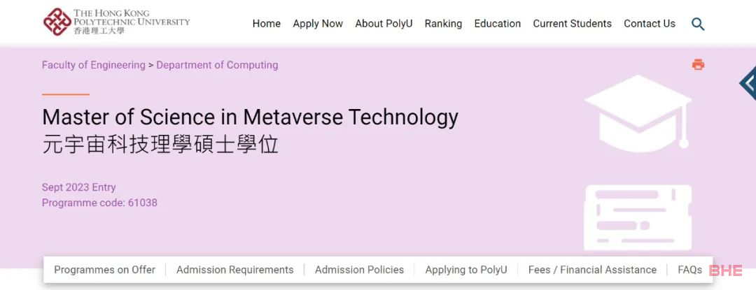 这是中国香港地区个开设“元宇宙”相关课程的大学,时长为1年,要求是计算机、工程或数学专业背景,比较倾向招收有相关工作经验的学生。