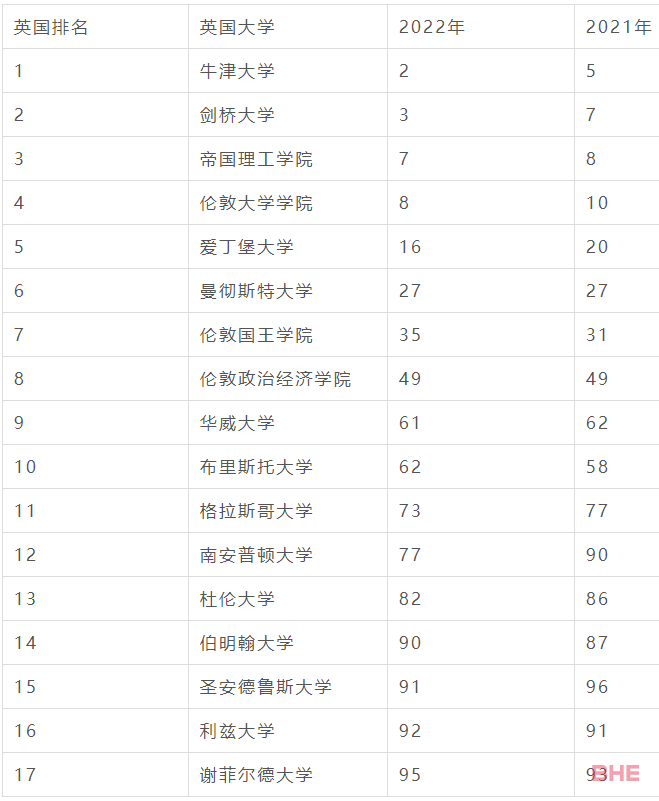 2022年QS排名:英国第17,世界第95