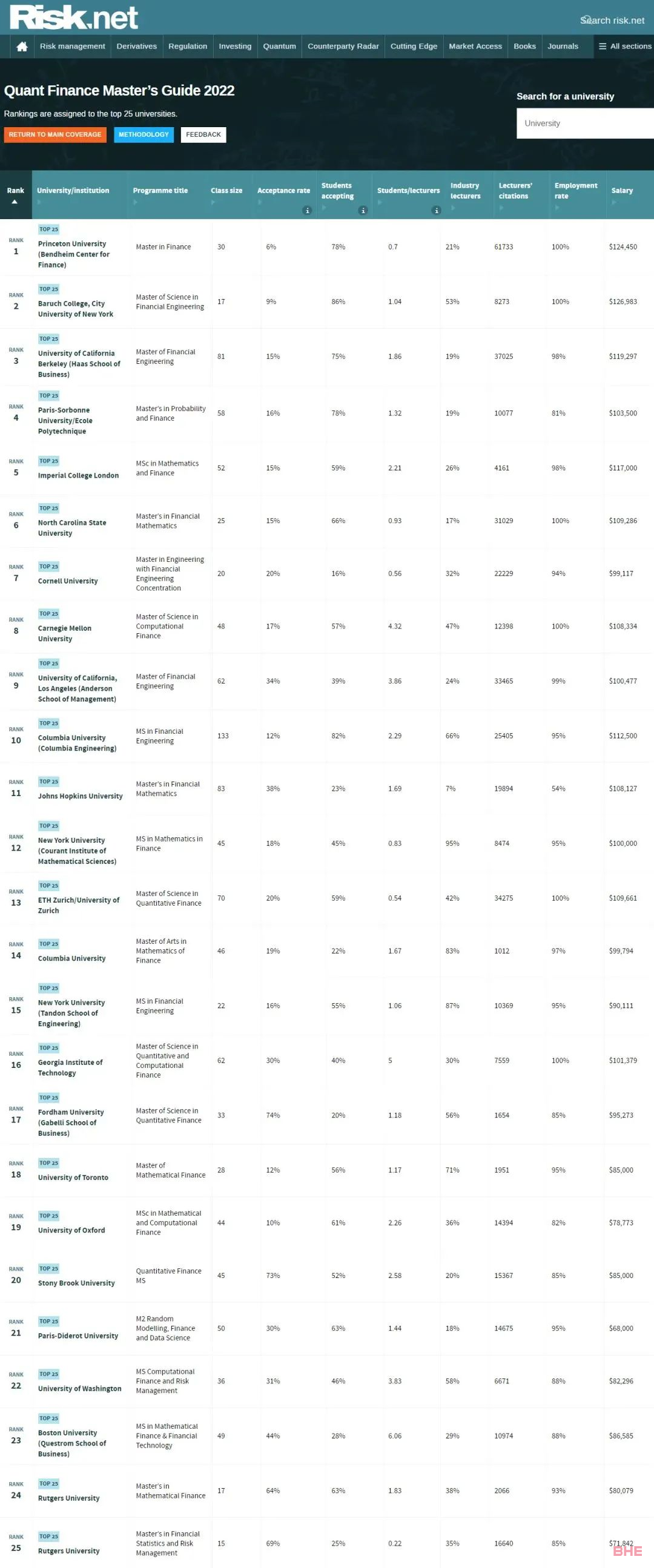 RiskNet是世界领先的新闻媒体,致力于在风险管理、金融衍生品和监管领域提供深度的新闻报道和分析。相比其他榜单,榜单中还统计了各个学校的录取率、就业率和薪资。